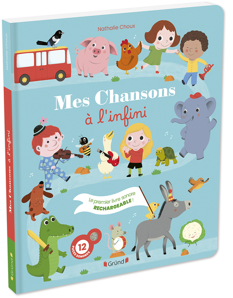 qu'il se recharge, sans piles pour écouter " à l'infini " douze chansons de notre répertoire : " C'est Gugusse " ; " Le rock & roll des gallinacés " ; " Si tu as de la joie au cœur " ; " Un éléphant qui se balançait " ; " Bonjour ma cousine " Les crocodiles " ; " La famille tortue " ; " La ronde des légumes " ; " Mon âne " ; Une araignée sur le plancher " ; " Dans la ferme de Mathurin " ; " The wheels on the bus