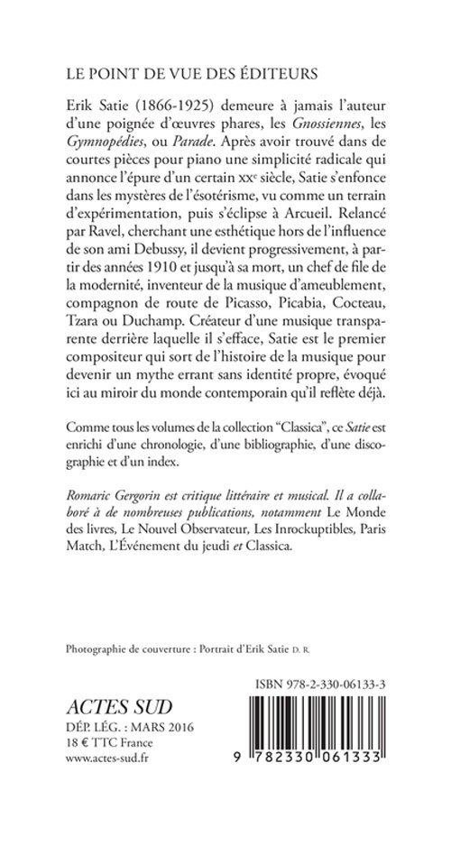 Comme tous les volumes de la collection "Classica", ce «Satie» est enrichi d'une chronologie, d'une bibliographie, d'une discographie et d'un index.
