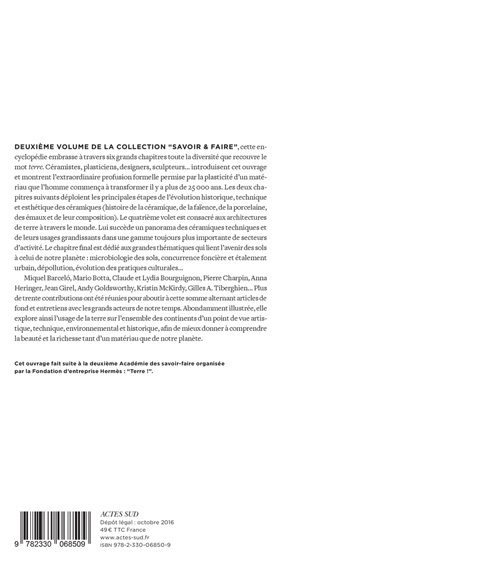 Deuxième volume de la collection « Savoir & Faire », cette encyclopédie embrasse à travers six grands chapitres toute la diversité que recouvre le mot terre. Céramistes, plasticiens, designers, sculpteurs... introduisent cet ouvrage et montrent l'extraordinaire profusion formelle permise par la plasticité d'un matériau que l'homme commença à transformer il y a plus de 25 000 ans. Les deux chapitres suivants déploient les principales étapes de l'évolution historique, technique et esthétique des céramiques (histoire de la céramique, de la faïence, de la porcelaine, des émaux et de leur composition). Le quatrième volet est consacré aux architectures de terre à travers le monde. Lui succède un panorama des céramiques techniques et de leurs usages grandissants dans une gamme toujours plus importante de secteurs d'activité. Le chapitre final est dédié aux grandes thématiques qui lient l'avenir des sols à celui de notre planète : microbiologie des sols, concurrence foncière et étalement urbain, dépollution, évolution des pratiques culturales...