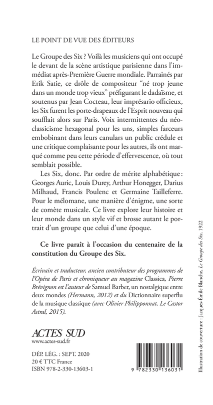 Le Groupe des Six ? Voilà les musiciens qui ont occupé le devant de la scène artistique parisienne dans l'immédiat après-Première Guerre mondiale. Parrainés par Erik Satie et soutenus par Jean Cocteau, à la fois leur imprésario et leur éminence grise, les Six furent les porte-drapeaux de l'Esprit Nouveau qui soufflait alors sur Paris. Voix intermittentes du néoclassicisme hexagonal pour les uns, simples farceurs embobinant dans leurs canulars un public crédule et une critique complaisante pour les autres, ils ont marqué comme peu cette période d'effervescence, où tout semblait possible. Les Six, donc : Georges Auric, Louis Durey, Arthur Honegger, Darius Milhaud, Francis Poulenc et Germaine Tailleferre.