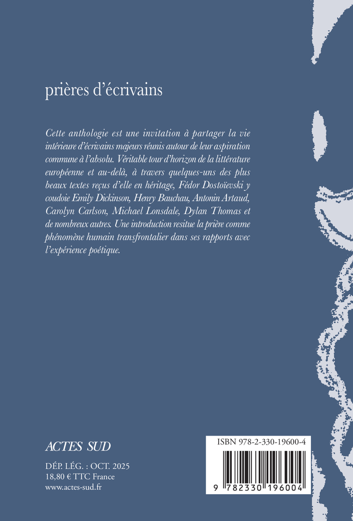 Cette anthologie est une invitation à partager la vie intérieure d'écrivains majeurs réunis autour de leur aspiration commune à l'absolu. Véritable tour d'horizon de la littérature européenne et au-delà, à travers quelques-uns des plus beaux textes reçus d'elle en héritage, Fédor Dostoïevski y coudoie Emily Dickinson, Henry Bauchau, Antonin Artaud, Carolyn Carlson, Michael Lonsdale, Dylan Thomas et de nombreux autres. Une introduction resitue la prière comme phénomène humain transfrontalier dans ses rapports avec l'expérience poétique.