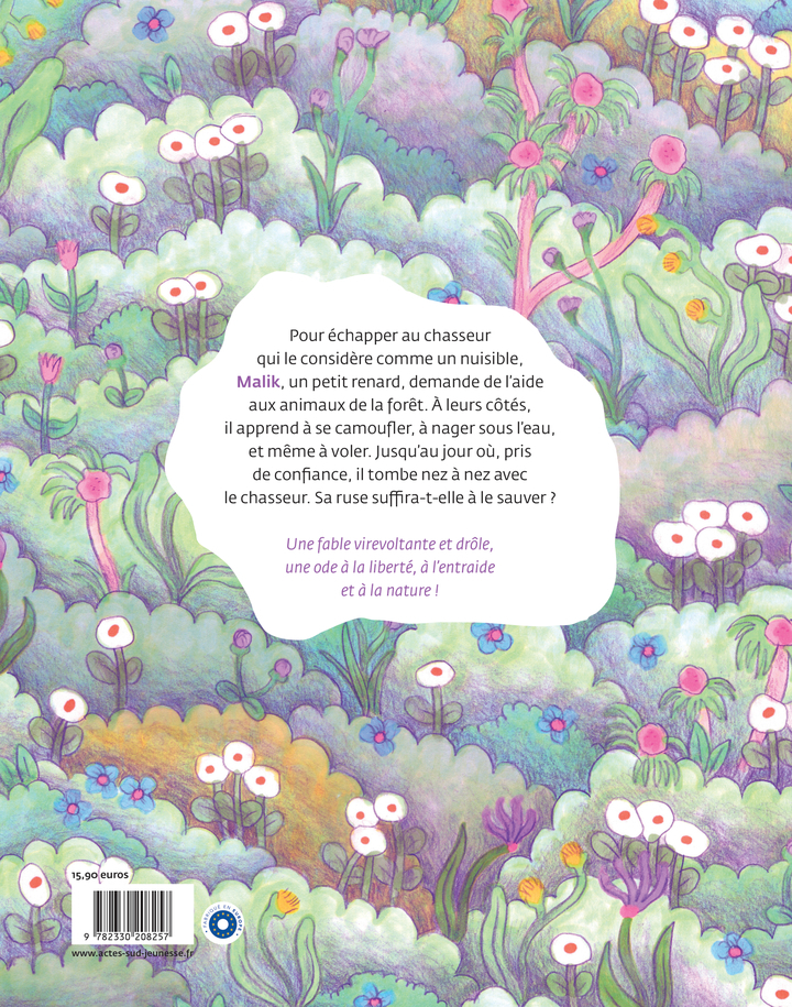 Pour échapper au chasseur qui le considère comme un nuisible, Malik, un petit renard, va imiter les animaux de la forêt. Il apprend ainsi à se camoufler, à voler et aussi à nager. Jusqu'au jour où, pris de confiance, il est démasqué et tombe nez à nez avec le chasseur. Sa ruse suffira-t-elle à le sauver ? Une fable virevoltante, et drôle ; une ode à la liberté, aux animaux et à la nature !