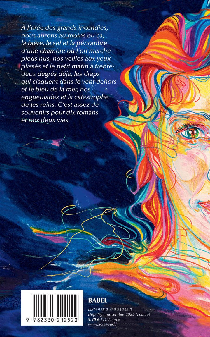 À l'orée des grands incendies, nous aurons au moins eu ça, la bière, le sel et la pénombre d'une chambre où l'on marche pieds nus, nos veilles aux yeux plissés et le petit matin à trente-deux degrés déjà, les draps qui claquent dans le vent dehors et le bleu de la mer, nos engueulades et la catastrophe de tes reins. C'est assez de souvenirs pour dix romans et nos deux vies.