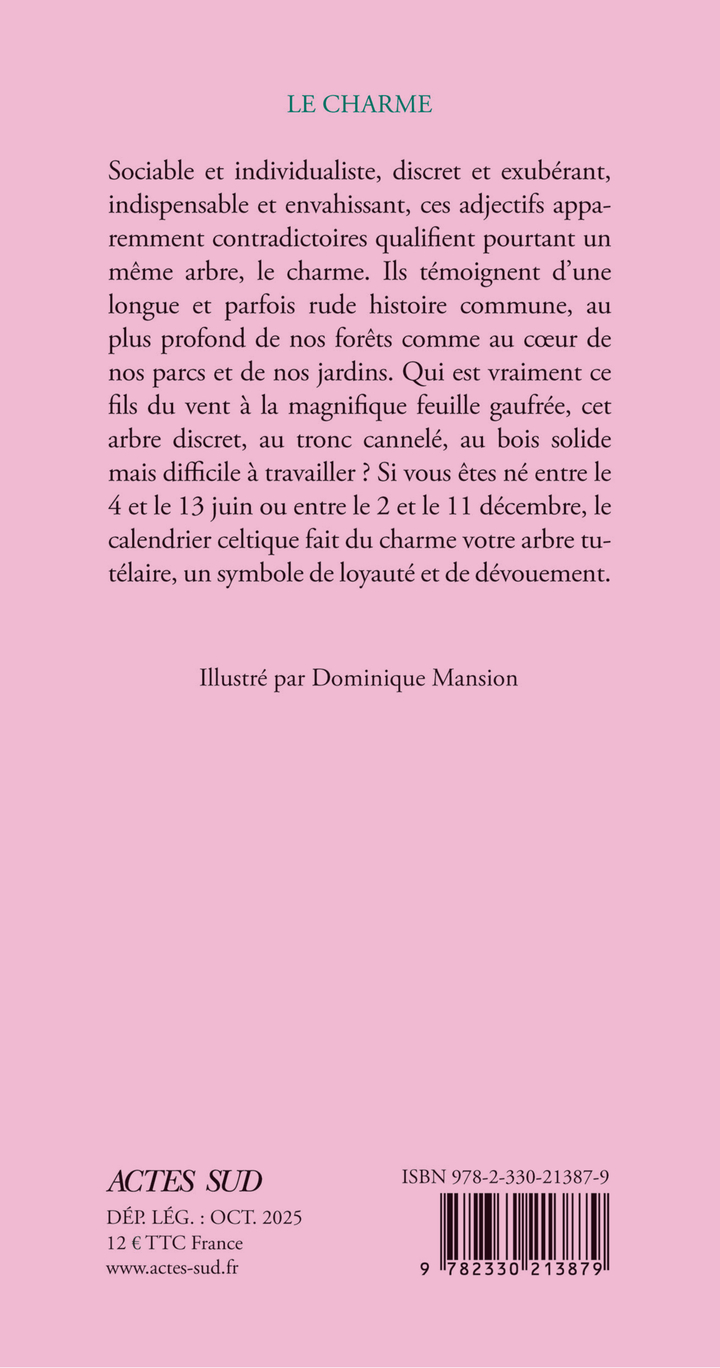 Une nouvelle édition avec rabats, sur papier de qualité, pour une collection emblématique « Le Nom de l'arbre » qui détaille l'anatomie et les besoins de chaque espèce et dévoile leur personnalité symbolique et leur place dans notre imaginaire. Petit arbre de bonne famille, Carpinus Betulus, autrement dit le charme au tronc argenté et aux feuilles joliment gaufrées, demande à être mieux connu. Forêts, bocages, ou jardins, il accepte tous les sols et son histoire se confond avec celle des hommes et de leurs paysages, de leur nature et de leur culture. Si vous êtes né entre le 4 et le 13 juin ou entre le 2 et le 11 décembre, le calendrier celtique fait du charme votre arbre tutélaire, un symbole de loyauté et de dévouement.