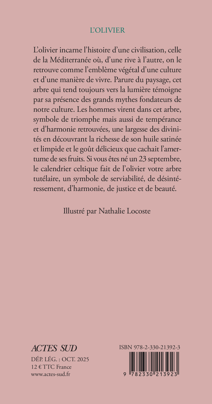Une nouvelle édition avec rabats, sur papier de qualité, pour une collection emblématique « Le Nom de l'arbre » qui détaille l'anatomie et les besoins de chaque espèce et dévoile leur personnalité symbolique et leur place dans notre imaginaire. L'olivier incarne l'histoire d'une civilisation, celle de la Méditerranée où, d'une rive à l'autre, on retrouve son image comme embl ème végétal d'un paysage, d'une culture et d'une manière de vivre. Si vous êtes né le 23 septembre, l'olivier, symbole de finesse et d'harmonie, est votre arbre tutélaire. Le natif de l'olivier met au service de la communauté ses fruits millénaires.