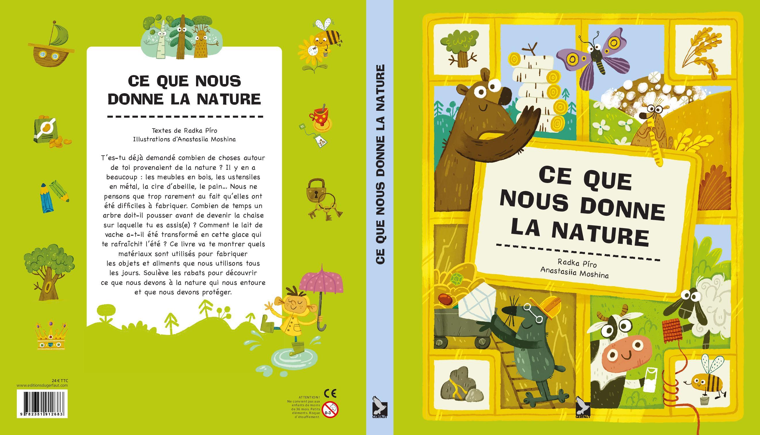 T'es-tu déjà demandé combien de choses autour de toi provenaient de la nature ? Il y en a beaucoup : les meubles en bois, les ustensiles en métal, la cire d'abeille, le pain... Nous ne pensons que trop rarement au fait qu'elles ont été difficiles à fabriquer. Combien de temps un arbre doit-il pousser avant de devenir la chaise sur laquelle tu es assis(e) ? Comment le lait de vache a-t-il été transformé en cette glace qui te rafraîchit l'été ? Ce livre va te montrer quels matériaux sont utilisés pour fabriquer les objets et aliments que nous utilisons tous les jours. Soulève les rabats pour découvrir ce que nous devons à la nature qui nous entoure et que nous devons protéger.