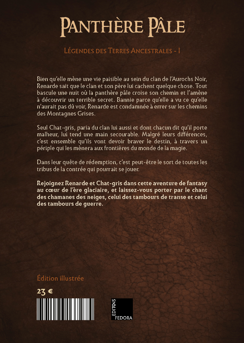 Bien qu’elle mène une vie paisible au sein du clan de l’Aurochs Noir, Renarde sait que le clan et son père lui cachent quelque chose. Tout bascule une nuit où la panthère pâle croise son chemin et l’amène à découvrir un terrible secret. Bannie parce qu’elle a vu ce qu’elle n’aurait pas dû voir, Renarde est condamnée à errer sur les chemins des Montagnes Grises. Seul Chat-gris, paria du clan lui aussi et dont chacun dit qu’il porte malheur, lui tend une main secourable. Malgré leurs différences, c’est ensemble qu’ils vont devoir braver le destin, à travers un périple qui les mènera aux frontières du monde de la magie. Dans leur quête de rédemption, c’est peut-être le sort de toutes les tribus de la contrée qui pourrait se jouer. Rejoignez Renarde et Chat-gris dans cette aventure de fantasy au coeur de l’ère glaciaire, et laissez-vous porter par le chant des chamanes des neiges, celui des tambours de transe et celui des tambours de guerre.