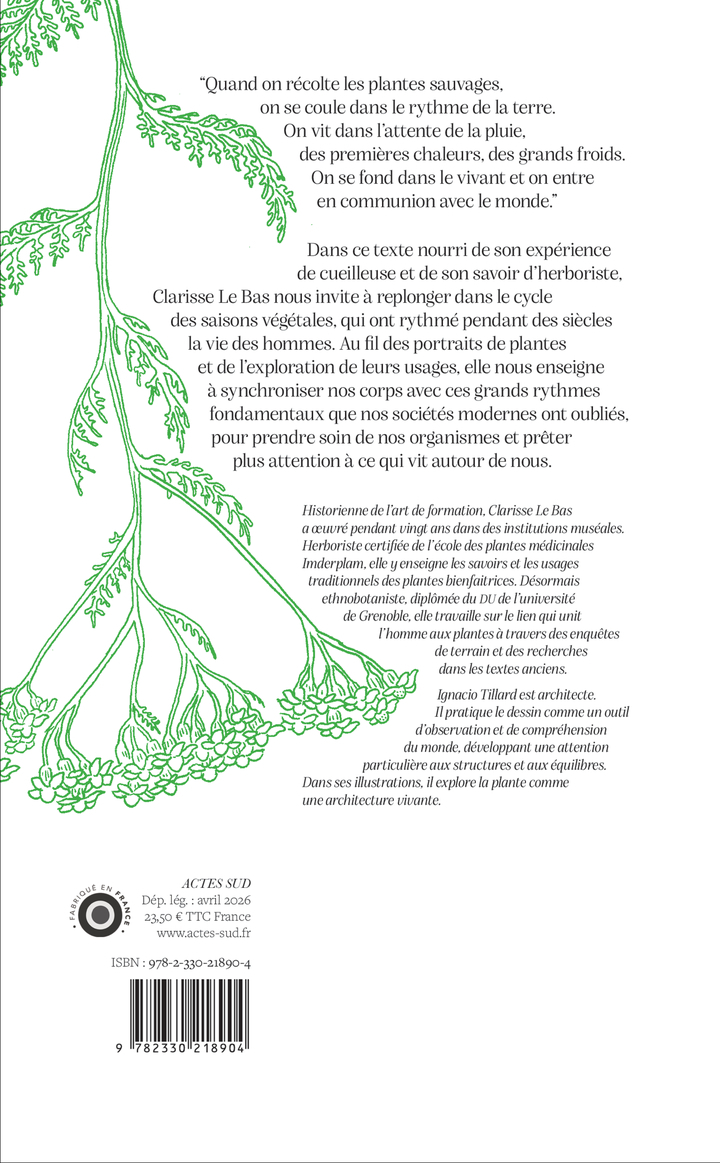 Dans ce texte nourri de son expérience de cueilleuse et de son savoir d'herboriste, Clarisse Le Bas nous invite à replonger dans le cycle des saisons végétales, qui ont rythmé pendant des siècles la vie des hommes. Au fil des portraits de plantes et de l'exploration de leurs usages, elle nous enseigne à synchroniser nos corps avec ces grands rythmes fondamentaux que nos sociétés modernes ont oubliés, pour prendre soin de nos organismes et prêter plus attention à ce qui vit autour de nous.