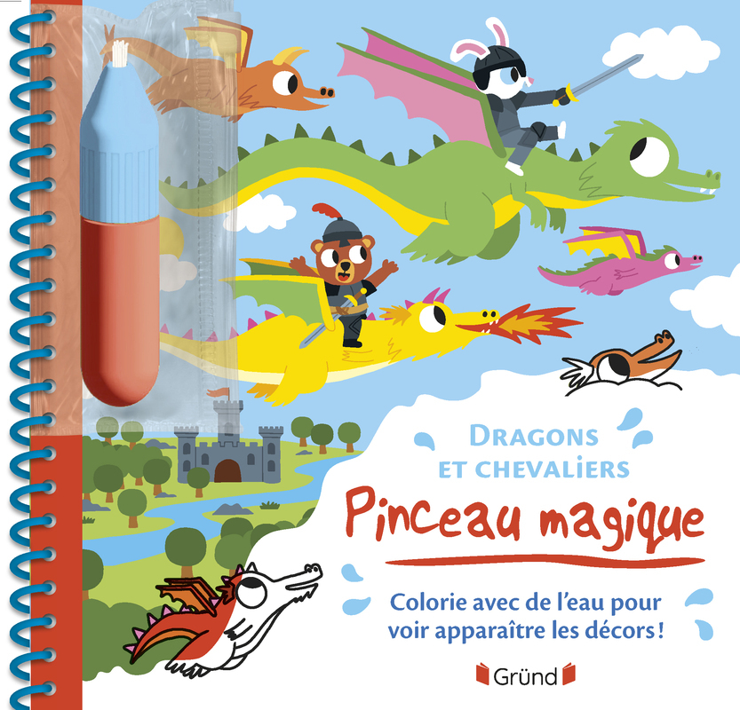 C'est magique ! Il suffit de remplir son pinceau avec de l'eau, puis de le passer sur les 6 décors du carnet pour voir apparaître des scènes avec des dragons et des chevaliers : l'attaque du château fort, le royaume des dragons, l'adoubement du chevalier, la course de dragons...