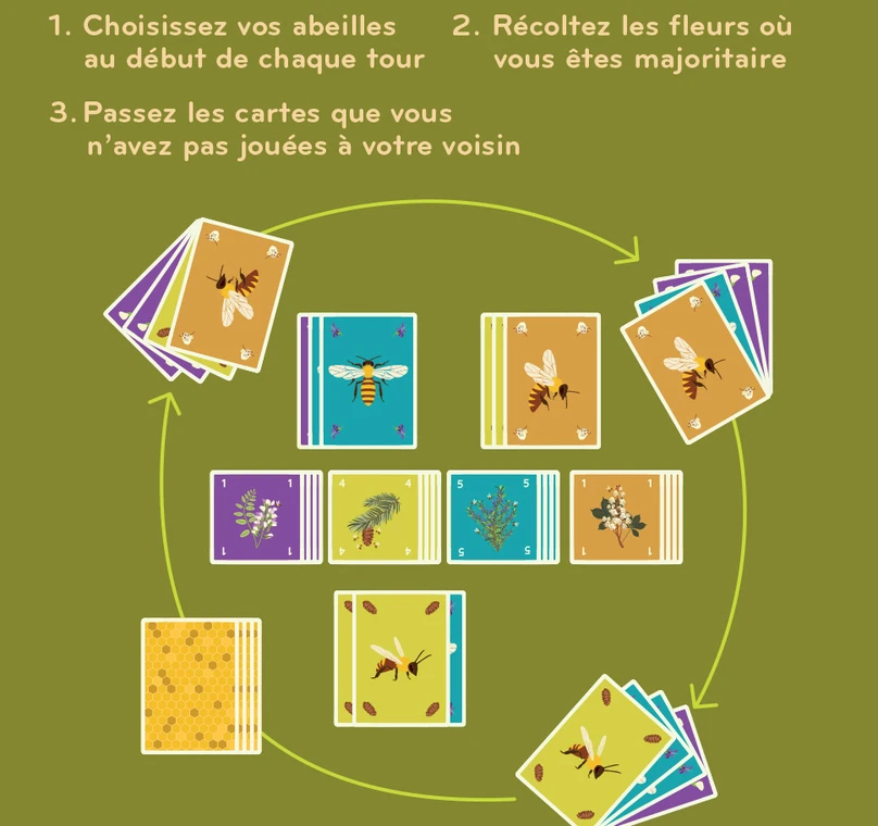 Dans Happy Bee, vous jouez des cartes abeilles et passez les autres à vos adversaires. Votre but : polliniser le plus grand nombre de fleurs. Choisissez bien les cartes abeilles que vous souhaitez jouer pour remporter la majorité et ainsi récupérer des fleurs. Mais prenez garde, vous n’êtes pas le ou la seul·e à vouloir récupérer les fleurs qui rapportent le plus de points de victoire.