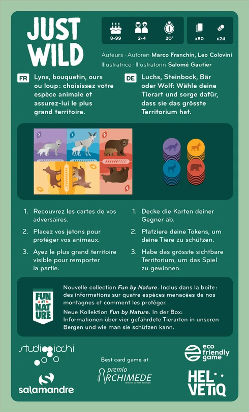 Lynx, ours, loup ou bouquetin : choisissez votre camp et luttez pour agrandir et protéger votre territoire. Dans Just Wild, 4 espèces d’animaux menacés doivent se partager l’espace. Placez soigneusement vos cartes pour bloquer vos adversaires et assurer la survie à votre espèce.